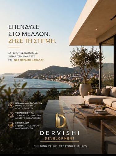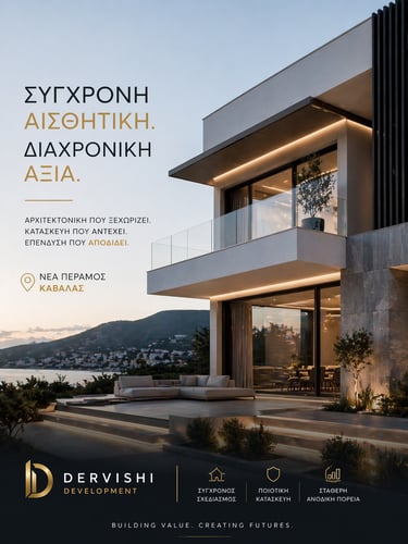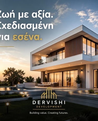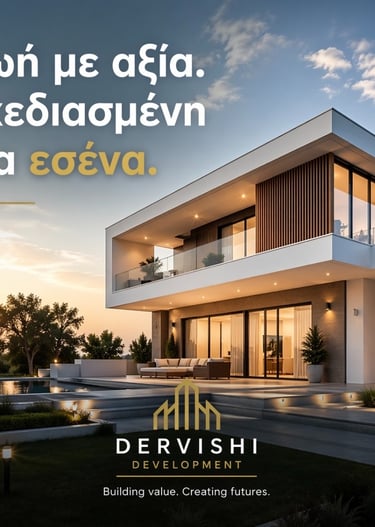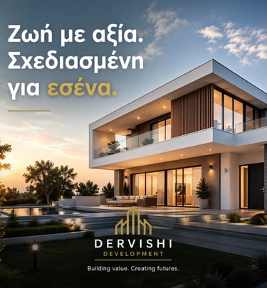 Στη Dervishi Development δημιουργούμε κατοικίες που συνδυάζουν σύγχρονο σχεδιασμό, ποιότητα και μοναδικές τοποθεσίες.